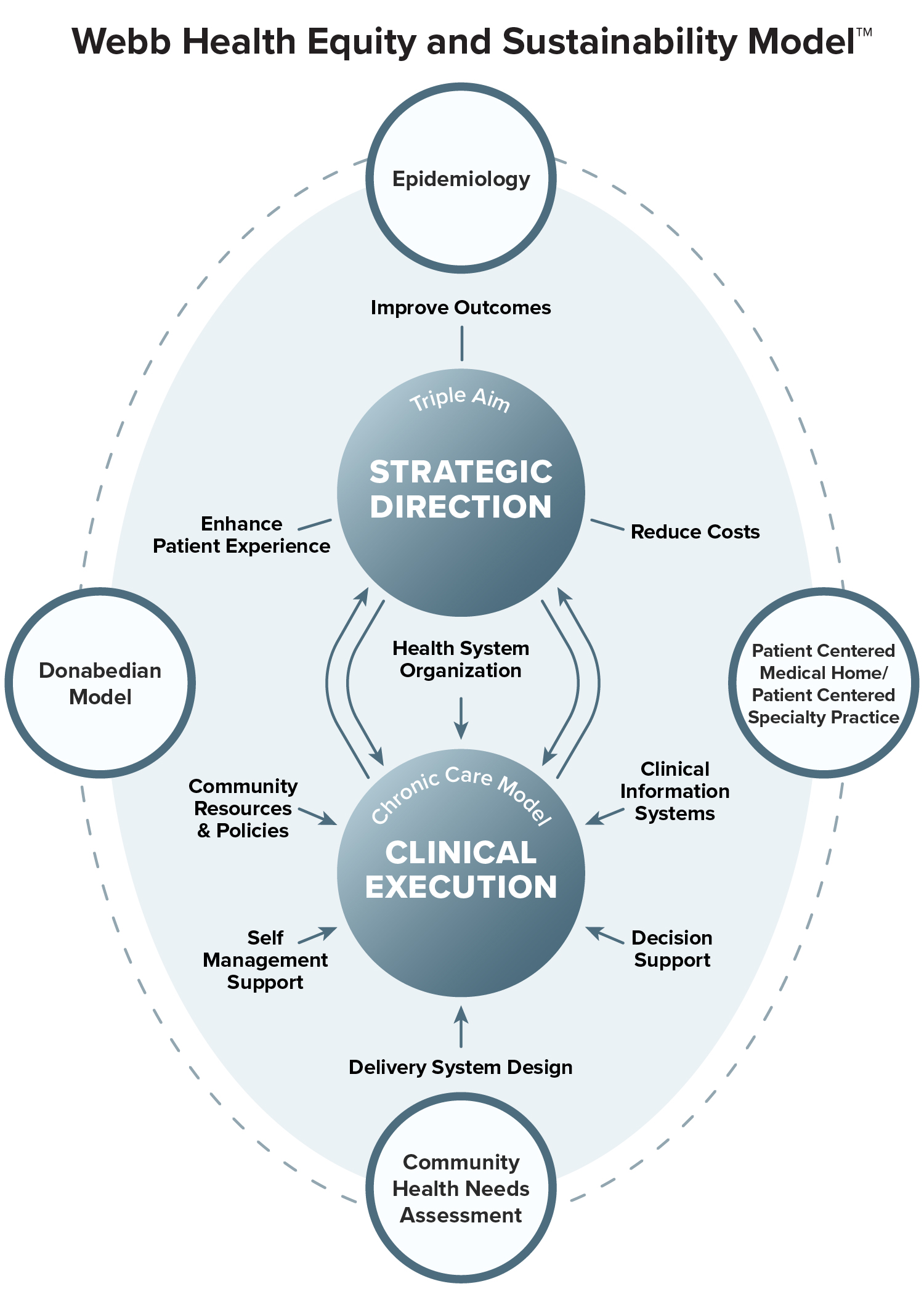 The Webb Health Equity and Sustainability Model is an evidence-based framework designed to achieve Population Health Management across organizations and communities. It integrates several proven theoretical models, each with strong, predictable outcomes, into a unified closed-loop system that fosters alignment, maximizes synergy, and delivers measurable, sustainable improvement